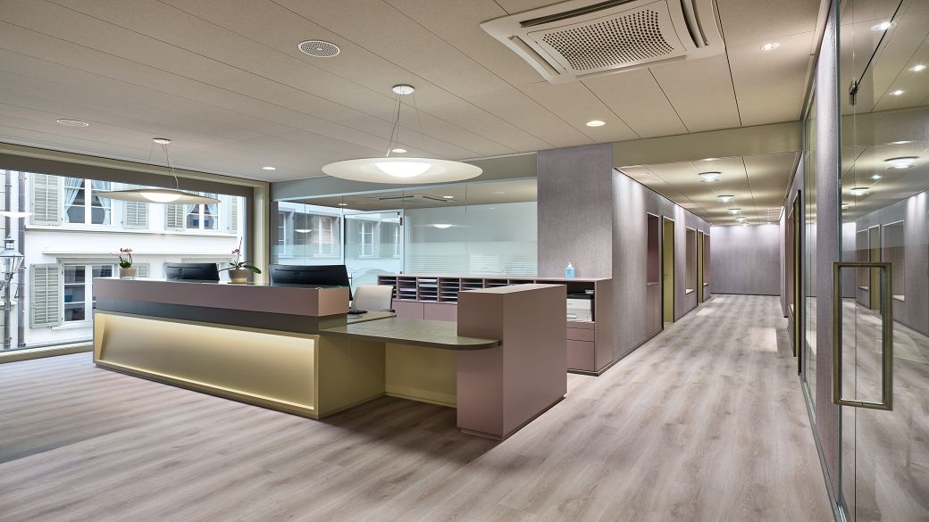 | Leistung: | Lichtdecke in Kombination mit Metalldecke im Eingangsbereich Fugenlose Akustikdecke vor dem Empfang Metalldecke bei Rezeption und Küche |