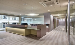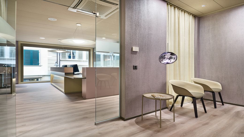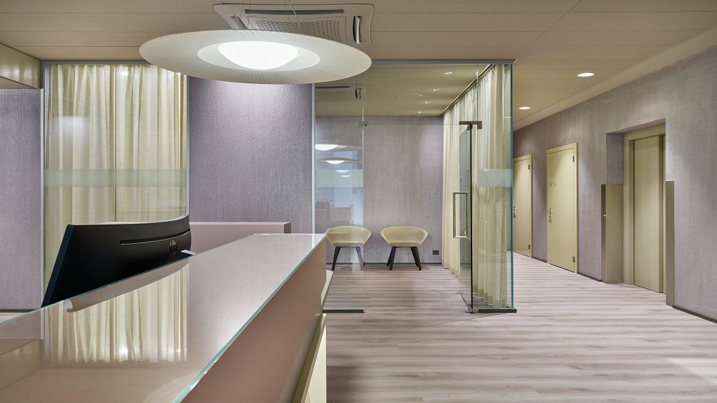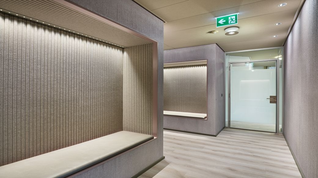 | Leistung: | Lichtdecke in Kombination mit Metalldecke im Eingangsbereich Fugenlose Akustikdecke vor dem Empfang Metalldecke bei Rezeption und Küche |
